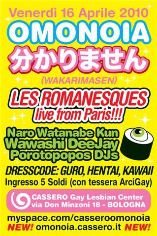Konnichiwa! Se pensate che Sailor Moon, il grottesco, il non-sense, la pornografia, Godzilla e lady Oscar non abbiano nulla in comune, è perché non siete mai stati a una serata Omonoia, il party queer del Cassero dove tutto acquista un senso nuovo. I suoi fedeli illuminati sono disposti a fare centinaia di chilometri per partecipare a questa esperienza a metà tra uno psicodramma goliardico e la pura messa in scena.